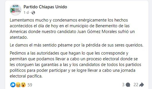 La incompetencia para controlar la violencia del gobierno morenista de Chiapas afloró este domingo una vez más: Juan Gómez Morales, candidato del partido Chiapas Unido, a la presidencia municipal de Benemérito de las Américas Chiapas, fue ejecutado a balazos por miembros del crimen organizado.