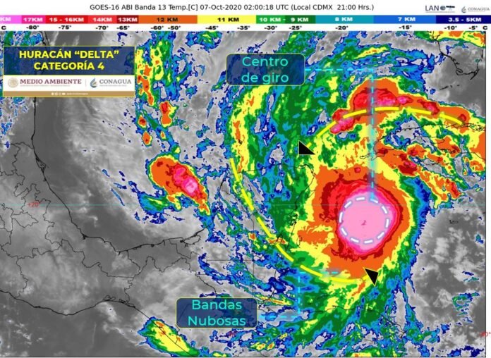 El centro del peligroso Huracán “Delta” de Categoría 4 en la escala Saffir-Simpson, muy cerca del norte de la Península de Yucatán. Se localiza a 220 km al este-sureste de Cozumel, Q.Roo. Produce lluvias intensas a torrenciales en la Península de Yucatán y originará vientos fuertes con rachas de 150 a 240 km/h, oleaje de 6 a 10 metros de altura y una marea de tormenta de 1 a 2 metros de altura en el norte de Quintana Roo y de 2 a 4 metros en las costas de Yucatán.