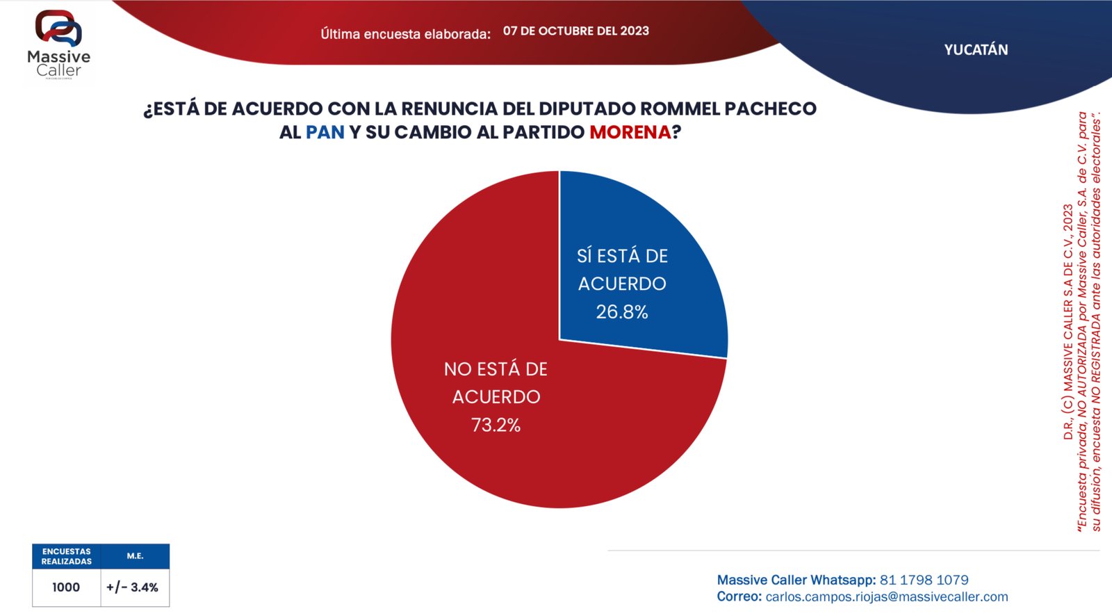 Esto fue reflejado por la firma consultora Massive Caller, quien confirma que de un universo del 100 por ciento de entrevistados el 73.2% de ellos, es decir, 7 de cada 10 no estuvo de acuerdo con el cambio de partido del ex clavadista del PAN a Morena, y solo el 26.8% de ellos dijo estar de acuerdo con este cambio de Pacheco Marrufo.