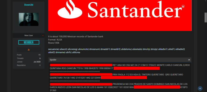 La publicación dice ” Mucho cuidado para todos los usuarios del Banco Santander México ya que están a la venta los datos de 100,000 cuentas. Es altamente recomendable que cambien sus contraseñas y nips. Hasta el momento el Banco no ha dado ningún comunicado.”