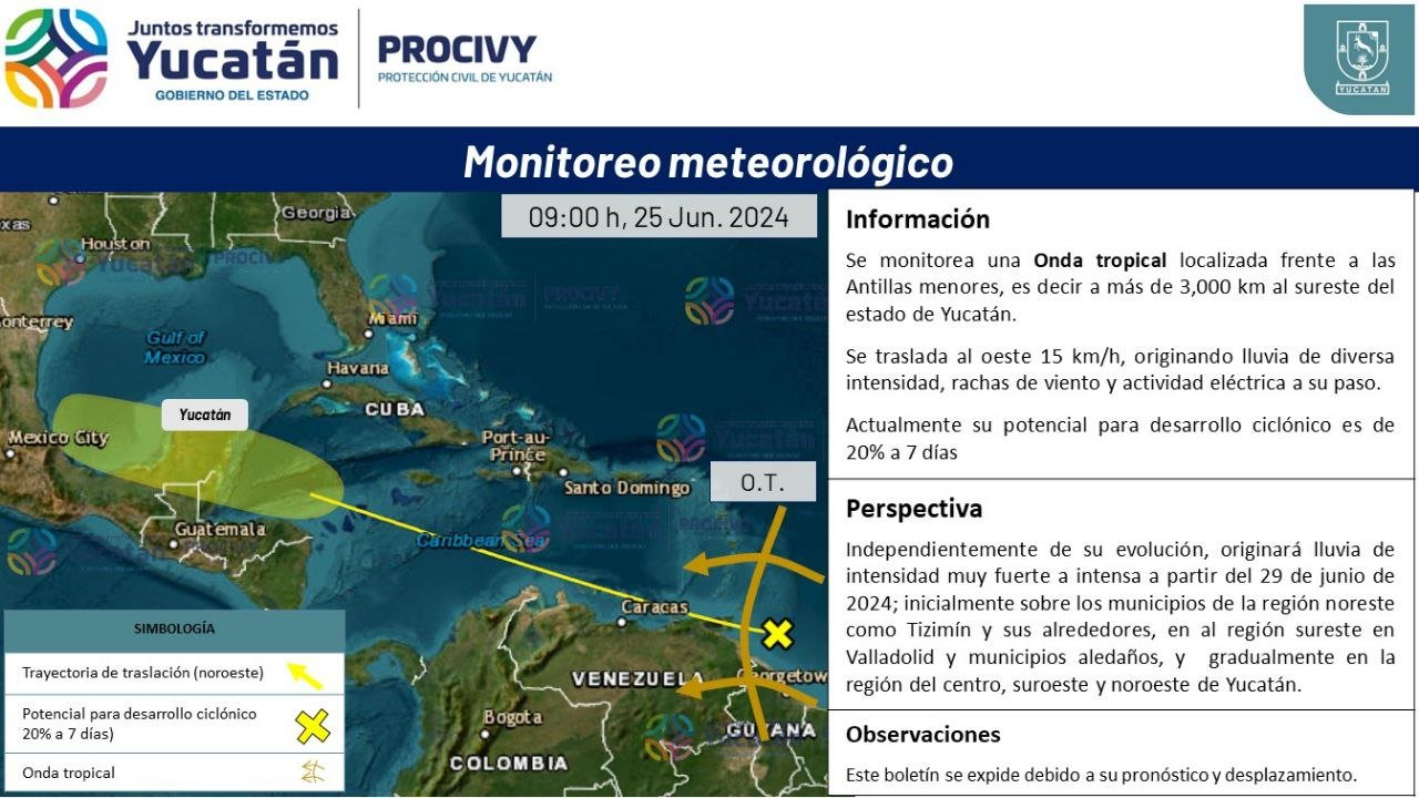 Se mantiene bajo vigilancia Onda Tropical localizada frente a las Antillas Menores con potencial para desarrollo ciclónico de 20 por ciento en 7 días, informó la Coordinación Estatal de Protección Civil. La zona de inestabilidad se mueve hacia el oeste a una velocidad de 15 km/h, se encuentra a más de 3 mil kilómetros de Yucatán y presenta condiciones favorables para ciclogénesis, pero independientemente de su evolución originará lluvias a partir de este sábado 29.