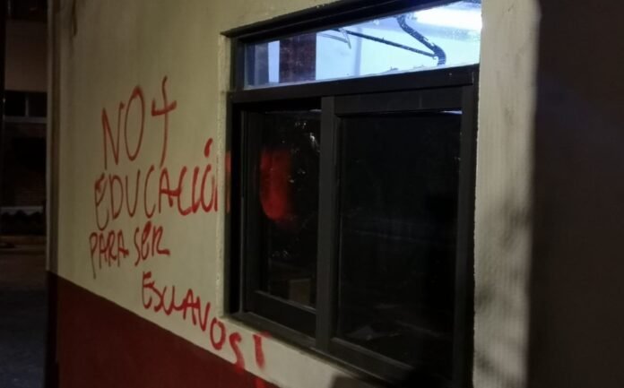 Dentro del plantel, ubicado en Calza Taxqueña 1620, alcaldía Coyoacán, causaron destrozos en el mobiliario y grafitearon algunos muros con mensajes como “No más educación para ser esclavos”.