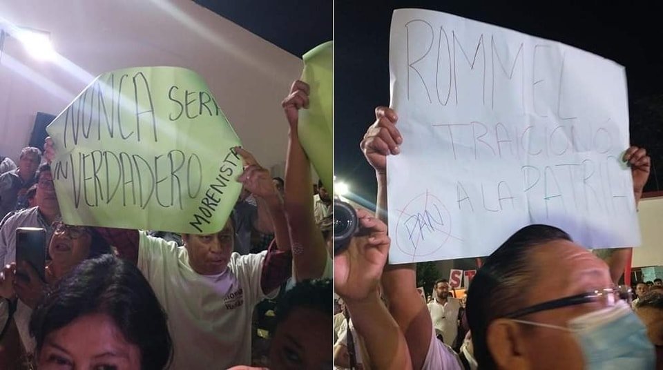 “Nunca será un verdadero morenista”, “Rommel traicionó a la patria” y “Rommel traidor” se leía en las pancartas que exhibieron morenistas contra Rommel Pacheco, quien hoy se inscribió como aspirante de Morena a la alcaldía de Mérida.