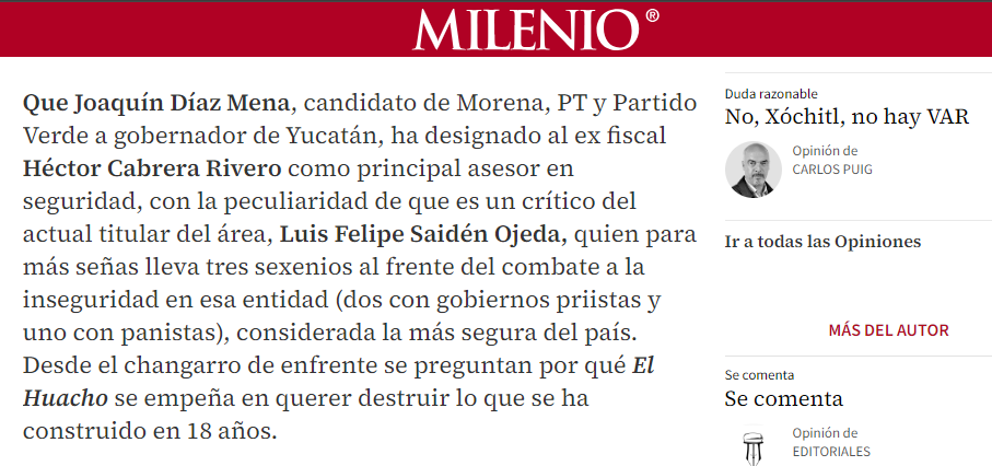 La designación de Díaz Mena de un asesor que ha sido crítico del trabajo de Saidén Ojeda ha generado interrogantes sobre el futuro de la seguridad en Yucatán. Desde diversos sectores se cuestiona el motivo detrás de la decisión del candidato, ya que pareciera contradecir los avances alcanzados en los últimos 18 años en materia de seguridad en el estado.