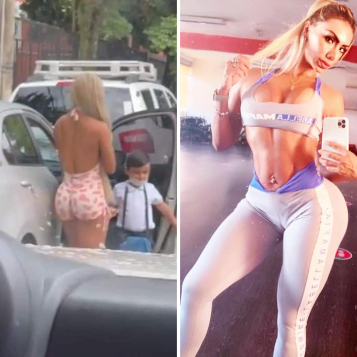 Vanesa Medina es fisicoculturista y madre del pequeño Fabrizio de 4 años, el día que fue al colegio -y que fue fotografiada- vestía un conjunto ajustado rosa, a espalda descubierta.