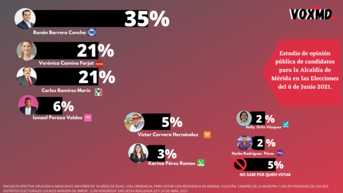La empresa VOXGROUP dio a conocer esta semana su Tercera encuesta realizada los días 23 y 24 de abril, mostrando un afianzado Renán Barrera en primer lugar con 35%.