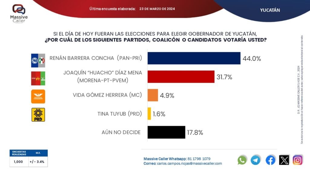 Aunque aún persiste un 17.8% de votantes indecisos, este porcentaje ha disminuido en comparación con mediciones anteriores. Renán Barrera Concha ha experimentado un crecimiento de 1.8 puntos en la última semana, mientras que Joaquín Díaz Mena ha sufrido una pérdida de hasta 3 puntos durante el mes de marzo.