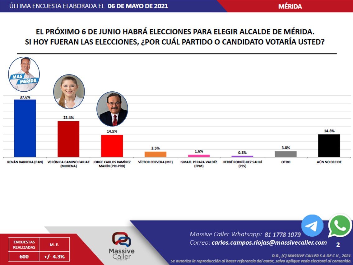 De acuerdo con la Encuesta Telefónica Municipal de Massive Caller, la intensión del voto para elegir Presidente Municipal en las comunidades de Mérida otorgan al panista una superioridad de 14.2% por encima de su rival más cercana, Verónica Camino Farjat, del partido Morena, que tiene un puntaje de 23.4% de preferencia del electorado, según la encuestadora.