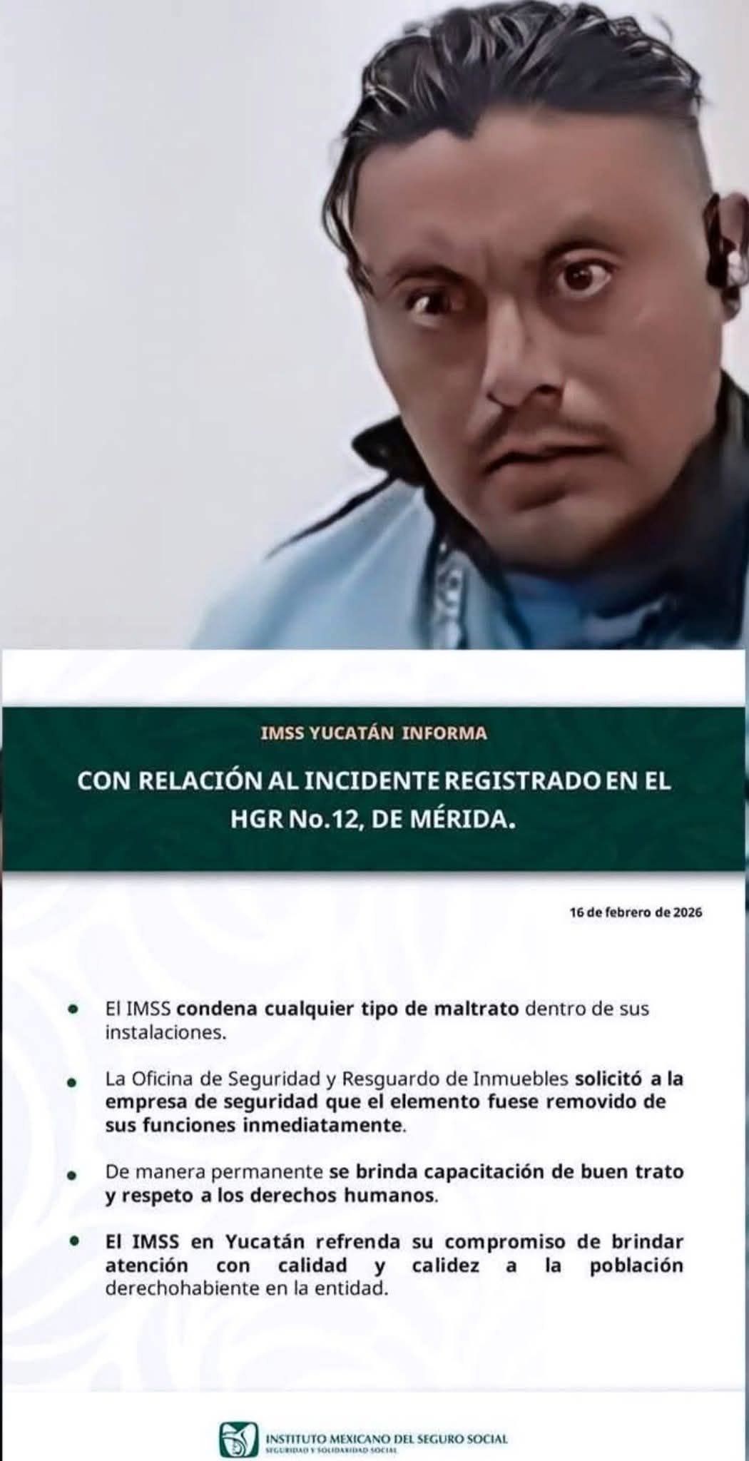 Luego de la difusión de un video en redes sociales donde un guardia de seguridad privada agrede físicamente a una mujer y empuja a varios derechohabientes en el Hospital General Regional No. 12 “Lic. Benito Juárez”, el Instituto Mexicano del Seguro Social (IMSS) en Yucatán informó que el elemento fue retirado de manera inmediata de las instalaciones.